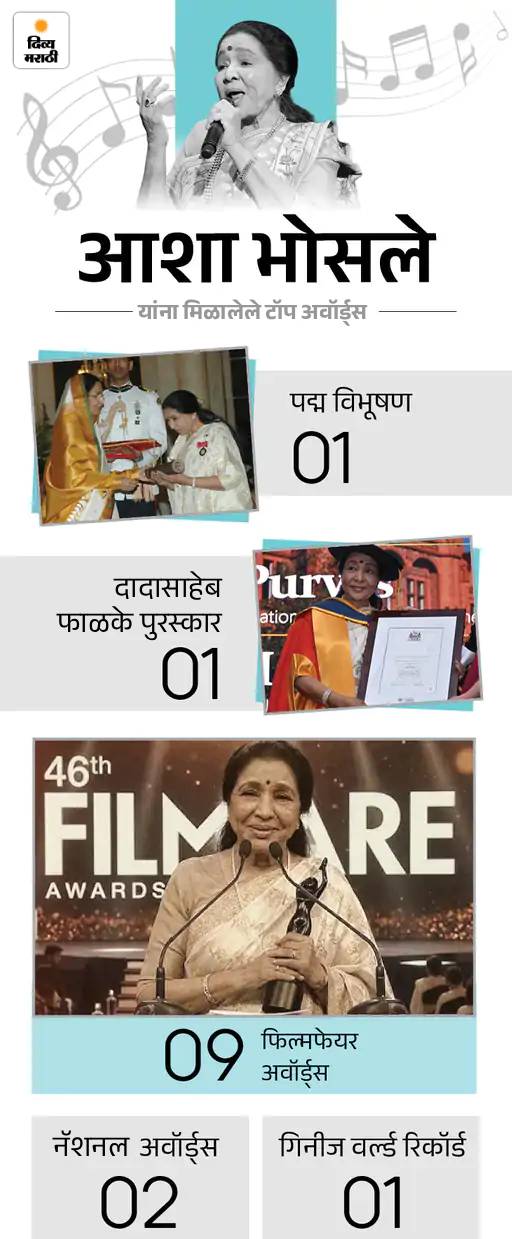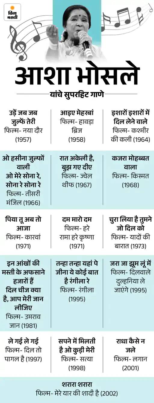भारतीय संगीत क्षेत्रातील सर्वात अष्टपैलू गायिका आशा भोसले यांचे वयाच्या 92 व्या वर्षी निधन झाले आहे. त्यांनी आपल्या आवाजाने सात दशके चित्रपटसृष्टीवर राज्य केले. वयाच्या 10 व्या वर्षी पहिले गाणे गाणाऱ्या आशा यांची गायन कारकीर्द 82 वर्षांची होती, ज्यात त्यांनी 12 हजारांहून अधिक गाणी गायली.
