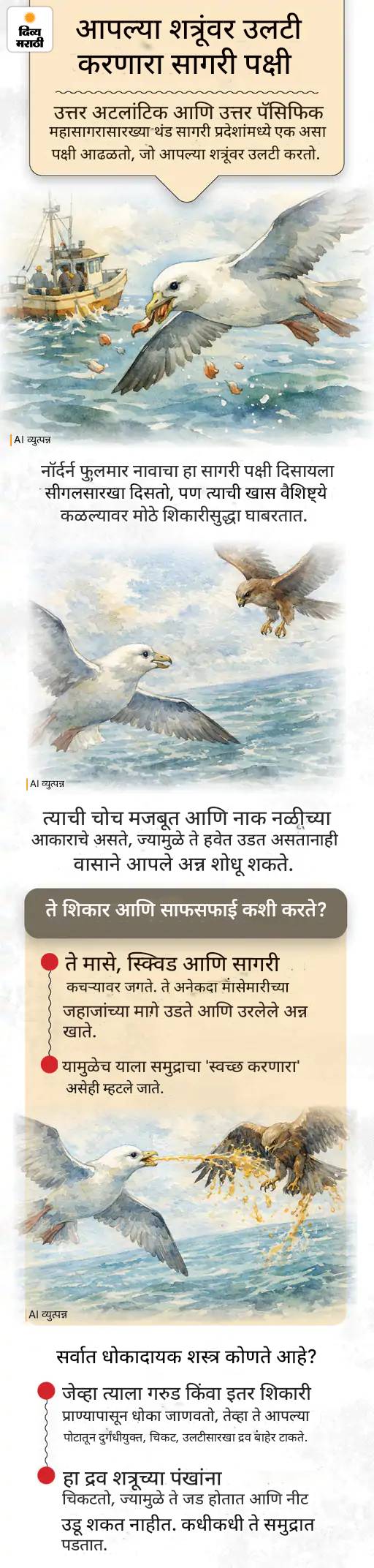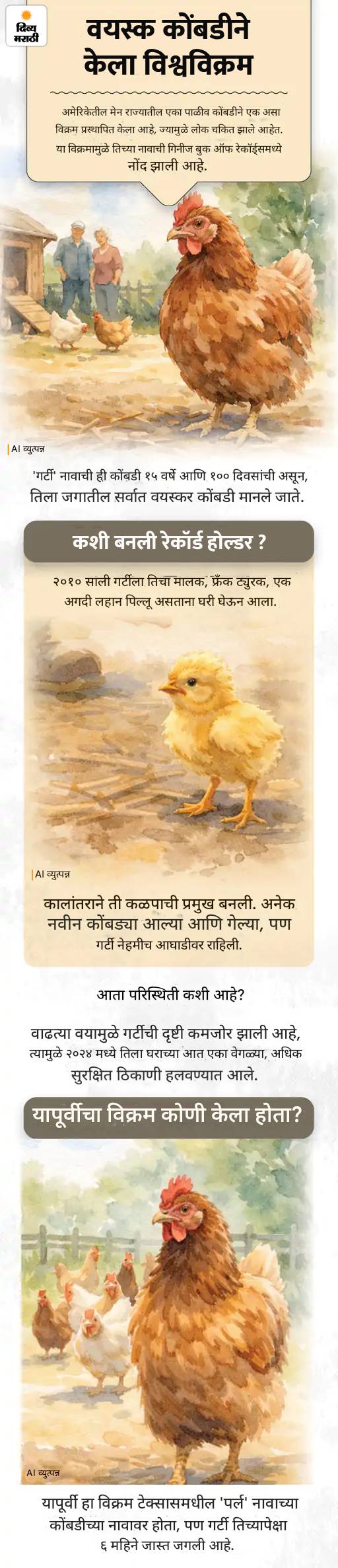 अमेरिकेत एका वृद्ध कोंबडीने गिनीज बुकमध्ये आपले नाव नोंदवले आहे. तर, अमेरिकेतीलच एका कंपनीला जास्त दारू पाजल्याच्या आरोपाखाली ₹2.3 कोटी रुपये देण्याचा न्यायालयाने आदेश दिला आहे. दुसरीकडे, थंड सागरी प्रदेशात एक असा पक्षी आढळतो, जो आपल्या शत्रूंवर उलटी करतो.