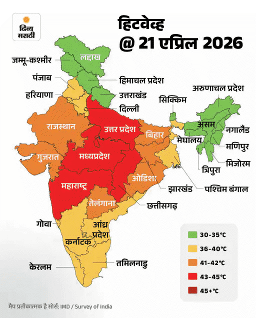 हवामान विभाग (IMD) ने हरियाणा, चंदीगड, दिल्ली, पंजाब, राजस्थान, विदर्भ, छत्तीसगड, राजस्थान, मध्य प्रदेश, पश्चिम बंगाल, झारखंड, ओडिशा आणि उत्तर प्रदेशच्या अनेक भागांमध्ये 20 ते 25 एप्रिल दरम्यान उष्णतेची लाट राहील.