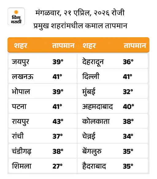 - झारखंड, ओडिशा आणि राजस्थानमध्ये उष्णतेच्या लाटेसारखी परिस्थिती निर्माण होऊ शकते. कर्नाटक आणि तामिळनाडूमध्ये उष्ण आणि दमट हवामान राहू शकते.