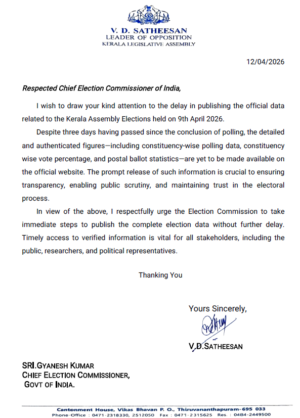 केरळ विधानसभेतील विरोधी पक्षनेते आणि परावूर मतदारसंघातील काँग्रेसचे उमेदवार व्ही.डी. सतीशन यांनी मुख्य निवडणूक आयुक्त ज्ञानेश कुमार यांना पत्र लिहिले आहे.